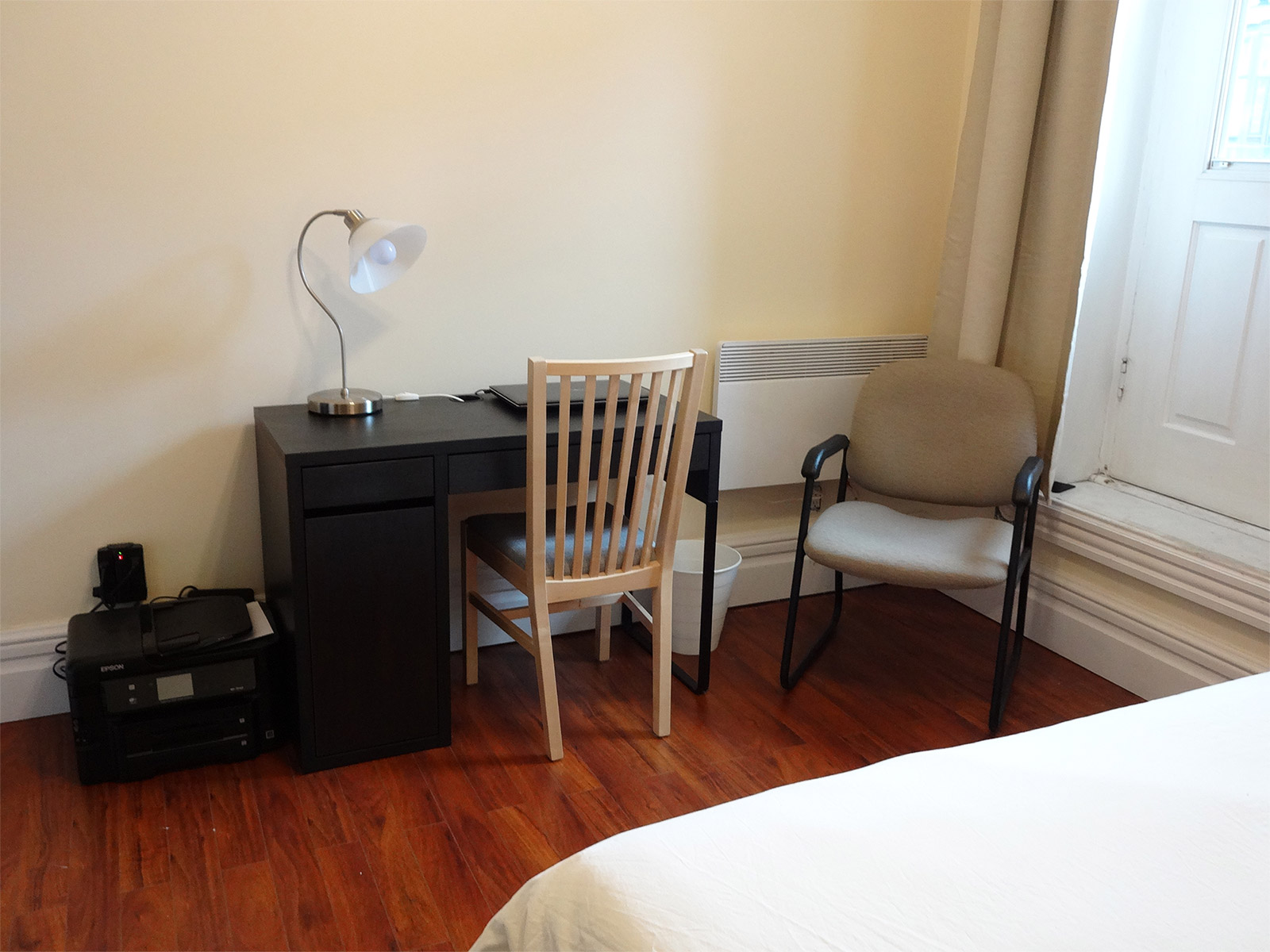 ATTENTION : Prendre note que les photos de cette chambre ne sont pas représentatives car elle sera remeublée prochainement. Lit double, table de chevet, armoire-penderie et bureau de travail.