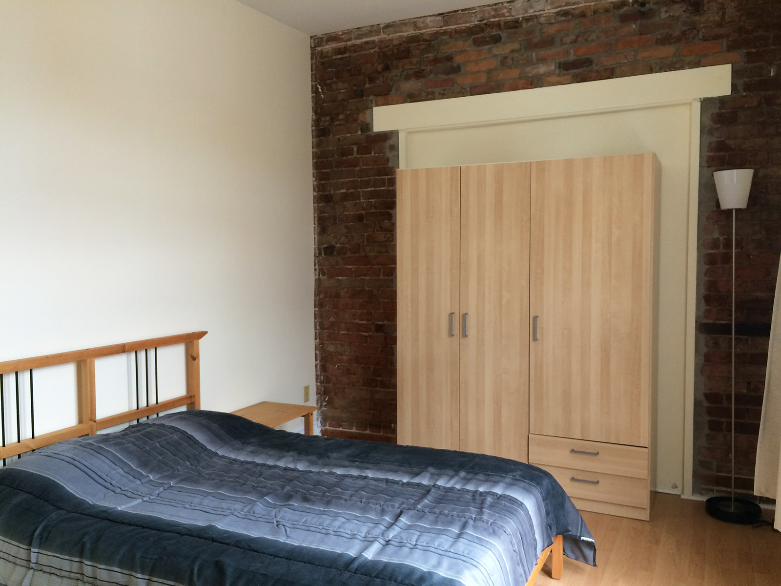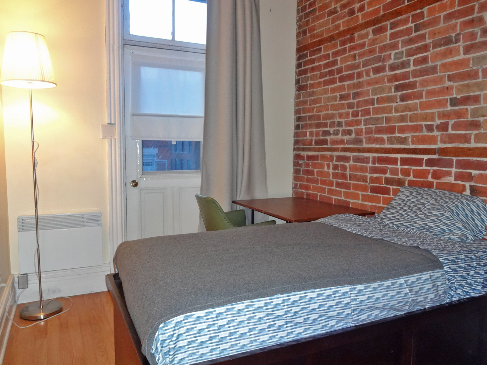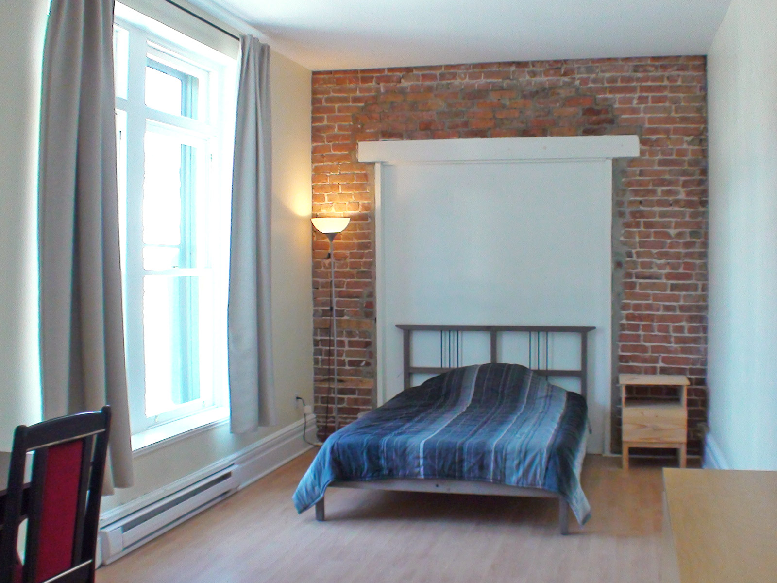 24 pi x 10 pi - Très grande chambre, avec coin repos, mur de brique et accès au balcon avant.