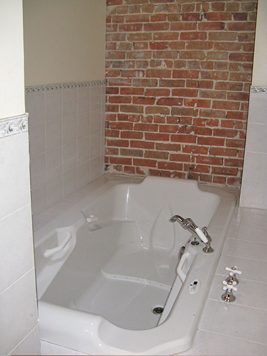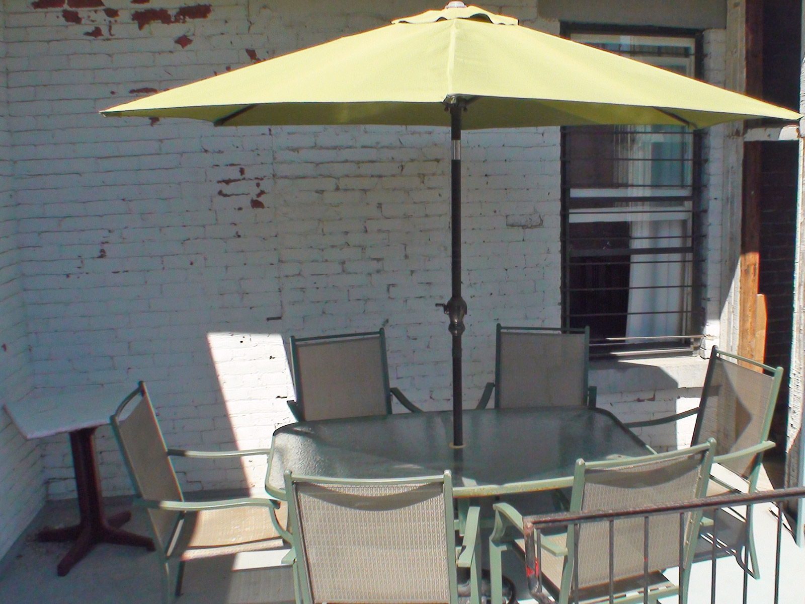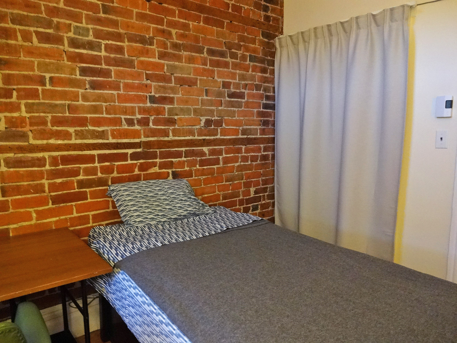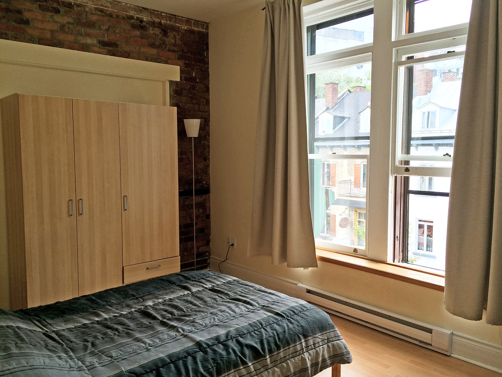 24 pi x 10 pi - Très grande chambre, avec coin repos, mur de brique et accès au balcon avant.